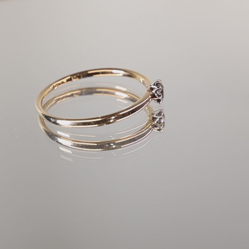 - Two-tone appearance at the setting, with a white-toned mount against the yellow gold band