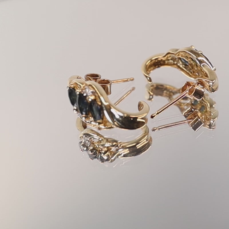 9Ct Gold Diamond And Sapphire Earrings in 9ct gold, set with deep blue sapphires and small diamond accents in a neat, leaf-inspired stud design. The look is refined and slightly organic, with curved goldwork that sits close to the ear for everyday wear.