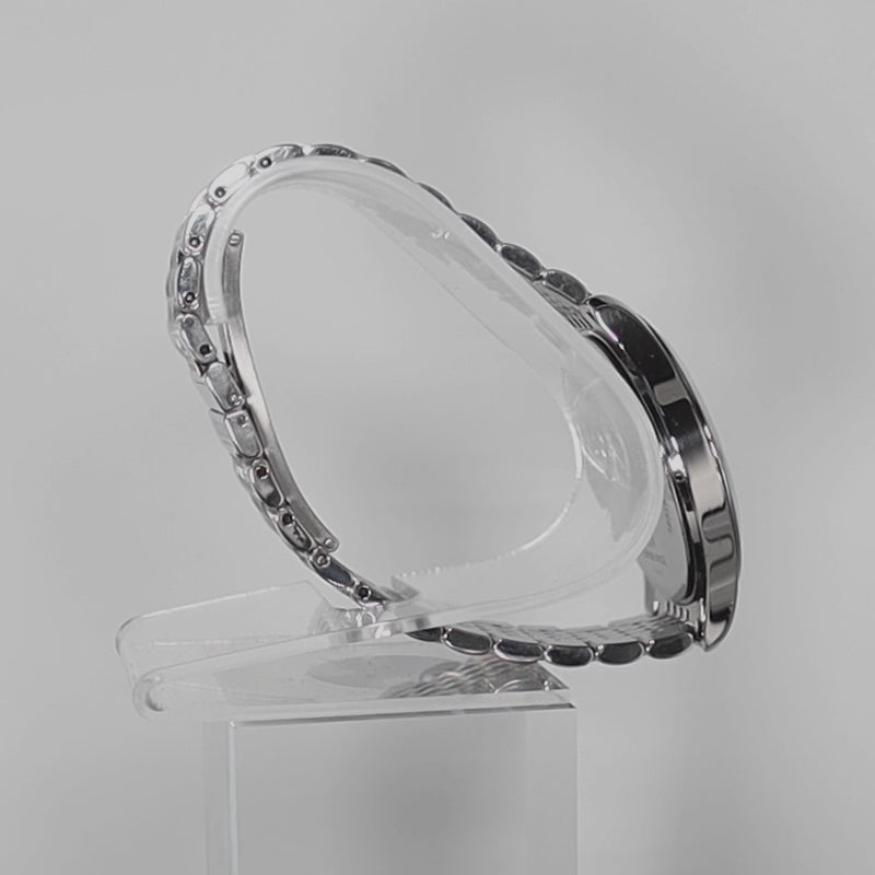 This piece is pre-owned and has been professionally inspected and cleaned. The metal bracelet and case show a mix of brushed and polished surfaces; for best results, wipe down after wear and avoid contact with chemicals or hard impacts that can mark the bezel and clasp.