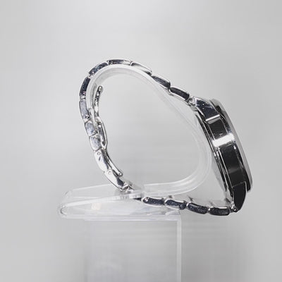 This watch is pre-owned and has been professionally inspected and cleaned. As with any pre-owned metal watch, light surface marks to the case and bracelet may be present; these are typically most visible on polished areas, so gentle wiping with a soft cloth after wear helps maintain the finish. Avoid pressing the chronograph pushers when the watch is wet, and store it dry and away from magnets to support consistent running.
